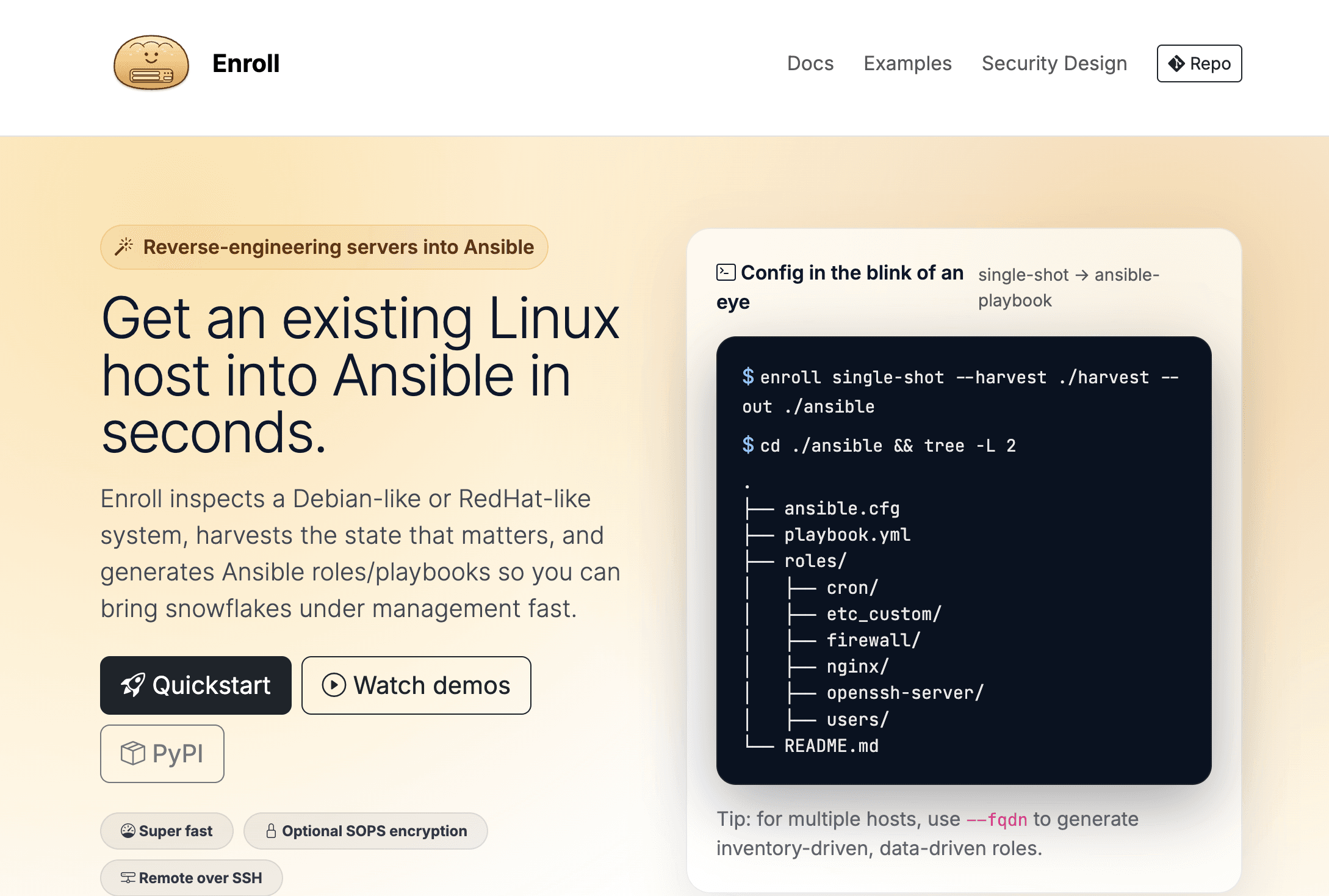 Enroll is an open-source tool that SSH’s into a live server and reverse-engineers its current state into Ansible playbooks and roles — useful for bootstrapping IaC on servers that were configured manually and never had automation written for them.